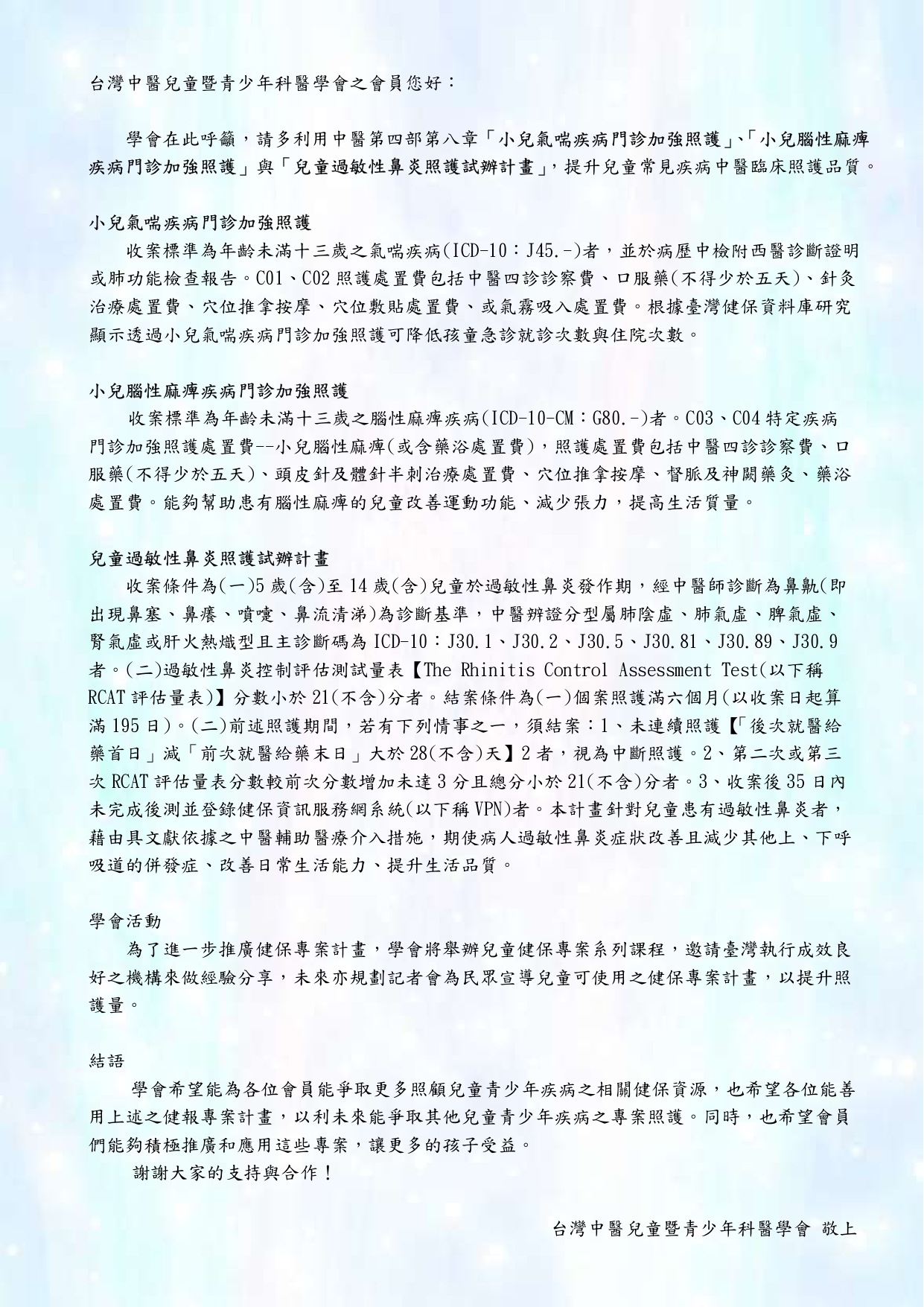 <公告>學會在此呼籲,請多利用中醫第四部第八章「小兒氣喘疾病門診加強照護」、「小兒腦性麻痺疾病門診加強照護」與「兒童過敏性鼻炎照護試辦計畫」,提升兒童常見疾病中醫臨床照護品質