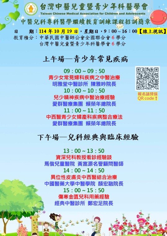 <公告>114年度中醫兒科專科醫學繼續教育帶狀課程,目前可報名全年度/單日上午場/單日下午場/一天課 ,報名網址:https://reurl.cc/1bWMgQ
